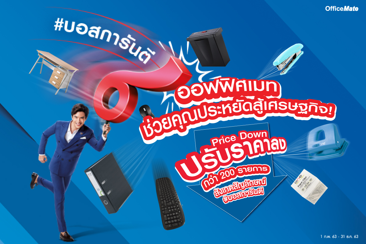 ออฟฟิศเมทพร้อมอาสาพาธุรกิจไทยประหยัด สู้เศรษฐกิจ!!! ออกแคมเปญใหม่ “#บอสการันตี” ด้วยการปรับราคาสินค้าจำเป็นสำหรับผู้ประกอบการ ให้ถูกลงกว่าเดิม กว่า 200 รายการ และยืนราคาถูกนี้ถึง 31 ธันวาคม 2563 เพื่อช่วยกระตุ้นให้ SME และฝ่ายจัดซื้อองค์กรทั่วประเทศมีโอกาสได้เลือกสินค้าคุณภาพดี และราคาประหยัด ที่ช่วยคุมงบประมาณได้ โดยครอบคลุมสินค้าจำเป็นสำหรับธุรกิจ อาทิ อุปกรณ์สำนักงาน ปากกา กระดาษถ่ายเอกสาร แฟ้ม เม้าส์ คีย์บอร์ด ปลั๊กไฟ โต๊ะ และเก้าอี้สำนักงาน, กลุ่มสินค้า SME เช่น อุปกรณ์แพ็คกิ้ง เทปกาว กล่องพัสดุ ซองเอกสาร และปากกามาร์คเกอร์ ไปจนถึง กลุ่มสินค้านิรภัยส่วนบุคคลในโรงงาน เช่น รองเท้านิรภัย และถุงมือ เป็นต้น
