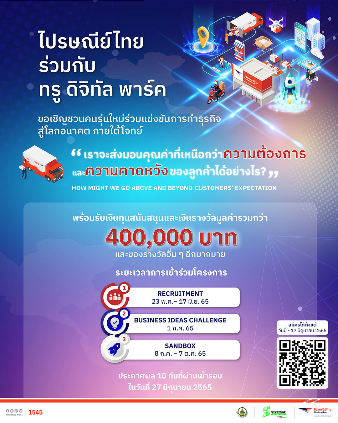 เนื่องด้วย “บริษัท ไปรษณีย์ไทย จำกัด ร่วมกับ ทรู ดิจิทัล พาร์ค จำกัด จัดการแข่งขัน Business Ideas Challenge การทำธุรกิจสู่โลกอนาคต และการให้บริการแก่ประชาชนที่