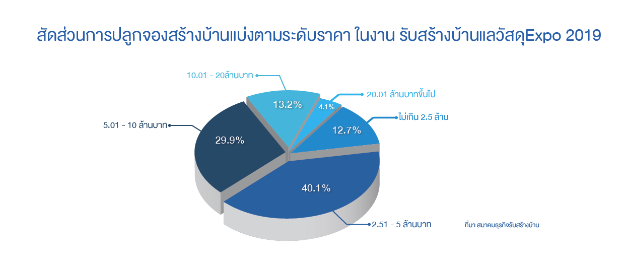 นางศิริพร กล่าวต่อไปว่า จากการเก็บตัวเลขยอดขายภายในงานโดยใช้มูลค่ารวมของการขายเป็นเกณฑ์ พบว่าในปีนี้ บ้านระดับราคา 2.51 – 5 ล้านบาท มีสัดส่วนสูงที่สุดคือ 40.1% รองลงมาคือบ้านระดับราคา 5.01 – 10 ล้านบาท ที่ 29.9% บ้านระดับราคา 10.01 – 20 ล้านบาท ที่ 13.2% ส่วนบ้านระดับราคาไม่เกิน 2.5 ล้านบาท มีสัดส่วน 12.7% และ บ้านระดับราคา 20.01 ล้านบาทขึ้นไปมีสัดส่วน 4.1% โดยตัวเลขดังกล่าวค่อนข้างแสดงให้เห็นว่าบ้านระดับกลางถึงบน มีกำลังซื้อที่หนาแน่นสุด เนื่องจากกลุ่มเป้าหมายกลุ่มนี้ได้รับผลกระทบทางเศรษฐกิจที่ไม่มากนัก ขณะเดียวกันเมื่อดูถึงแนวโน้มความต้องการปลูกสร้างบ้าน ซึ่งเป็นการสำรวจผู้บริโภคที่เข้าชมงานพบว่า ส่วนใหญ่ต้องการปลูกสร้างบ้านภายใน 3-6 เดือนซึ่งน่าจะส่งผลดีต่อภาพรวมตลาดรับสร้างบ้านด้วยเช่นกัน