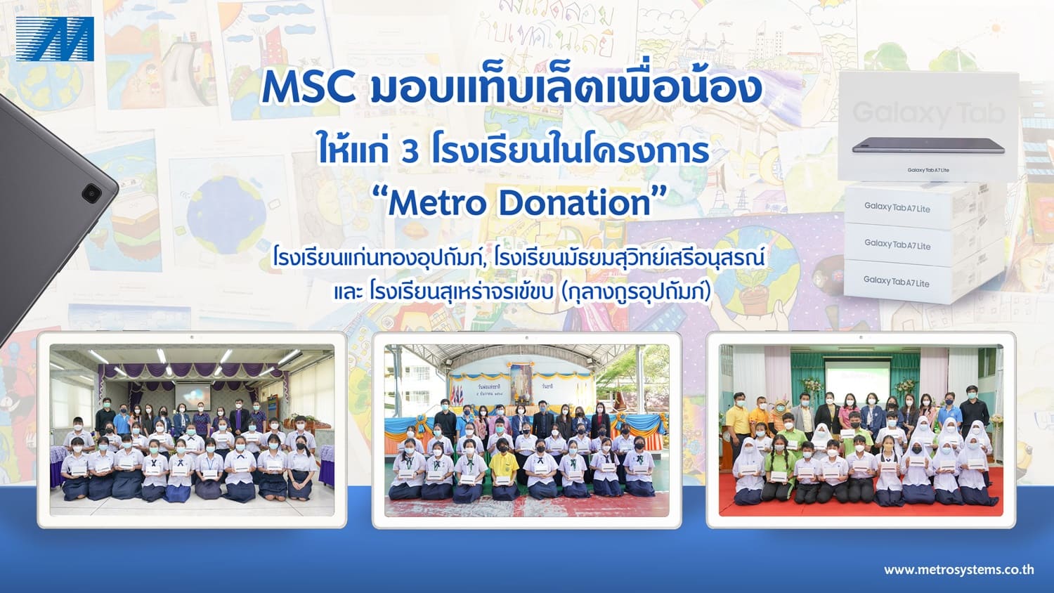 บริษัท เมโทรซิสเต็มส์คอร์ปอเรชั่น จำกัด (มหาชน) หรือ MSC โดยคุณสุเมตตา จิตต์ศิริผล รองกรรมการผู้จัดการกลุ่มบริหารงานทั่วไป/ รองกรรมการผู้จัดการกลุ่มกิจการองค์กร ส่งมอบแท็บเล็ตในโครงการ “Metro Donation” จำนวน 50 เครื่องให้กับ 3 โรงเรียนที่ร่วมโครงการกิจกรรมวาดภาพระบายสีในหัวข้อ “สิ่งแวดล้อมกับเทคโนโลยี” ได้แก่ โรงเรียนแก่นทองอุปถัมภ์, โรงเรียนมัธยมสุวิทย์เสรีอนุสรณ์ และ โรงเรียนสุเหร่าจรเข้ขบ (กุลางกูรอุปถัมภ์) เมื่อวันอังคารที่ 7 ธันวาคม 2564